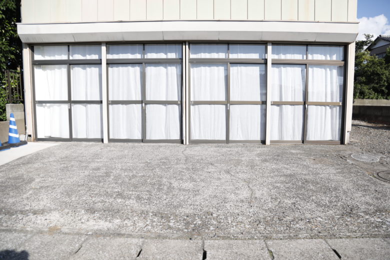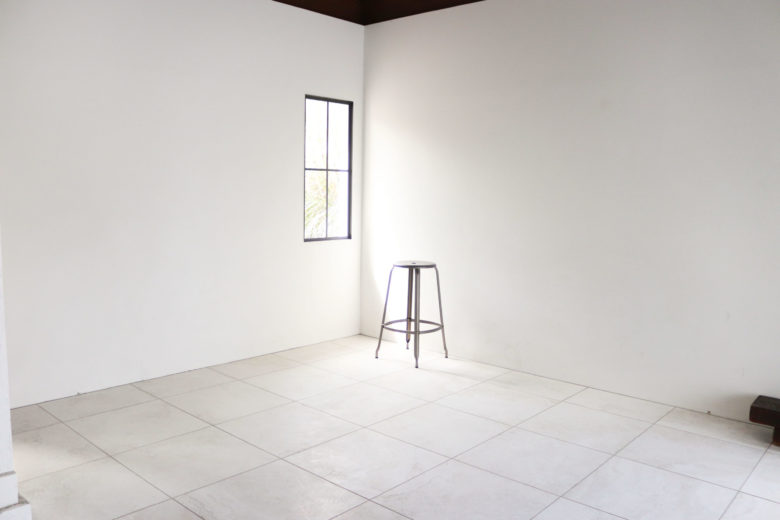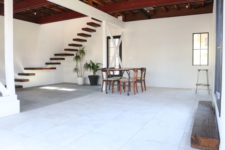 3面採光なので1階でも自然光が周り、撮影しやすいとご好評をいただいております。白とグレーのシンプルモダンな空間の1階モルタル床部分は、バイク、自転車を入れてガレージ風に撮影することも可能です。