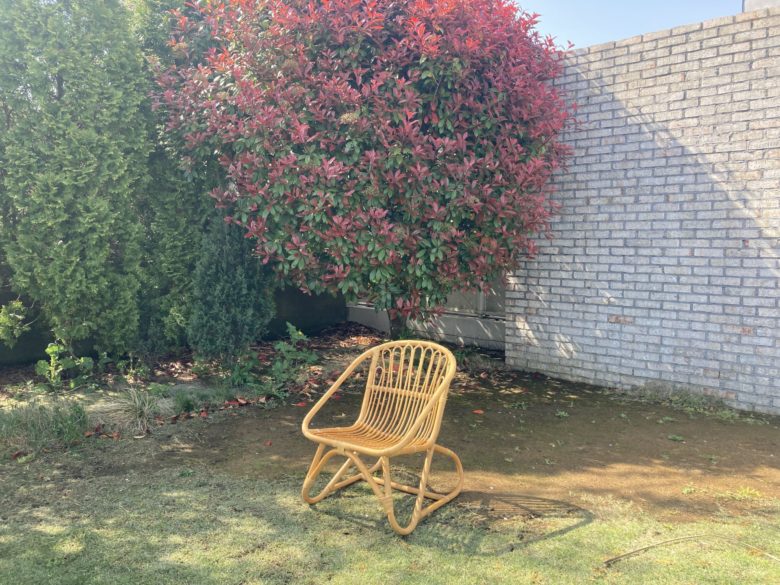 庭の背景:植栽のグリーン、高さ3m幅7mの煉瓦壁、ベージュ砂利とオージープランツ、黒コンテナ壁、365日緑の天然芝の芝生